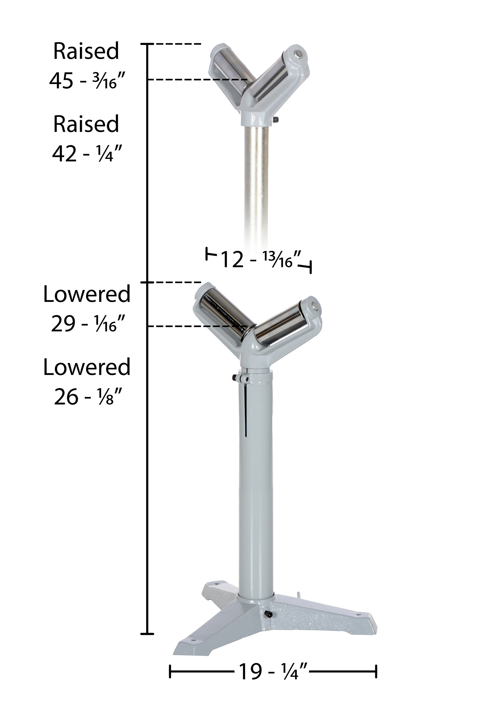 The deluxe roller stand is designed for use as an extra hand when working with long materials. Each stand includes chrome plated rollers and heavy-duty cast-steel base. This roller stand is a v-groove roller design. The height of each stand is adjusted with a friction lock screw or a gas charged cylinder. The unit is great for use in machine and wood shops.