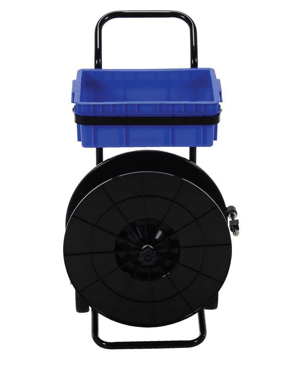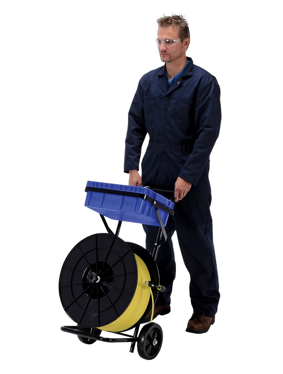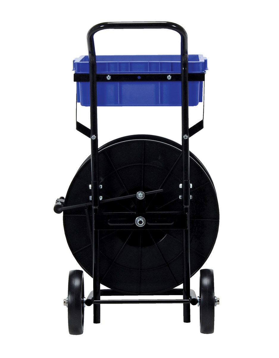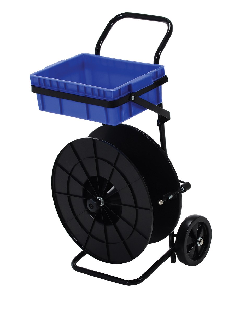 The strapping cart is a lightweight cart with plastic disc and integral tool tray. The unit is designed for use with poly strapping that has a core size of 8" x 8". The cart is great for everyday use around the warehouse, including box sealing and bundle applications. Two plastic wheel s for easy maneuvering.