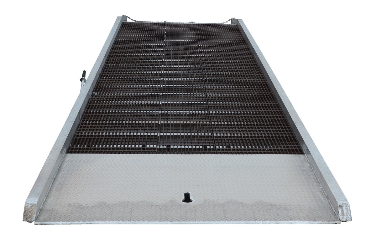 The portable Aluminum Yard Ramp with steel grating has a unique design that allows one person to position the ramp, adjust its service height, and load or unload trailers from ground level. It includes hand pump hydraulic lift, safety pressure relief valve, anchor chains, and tow bar pocket.