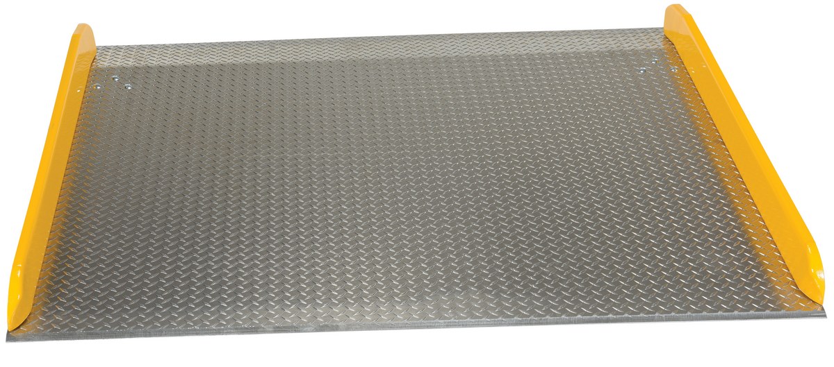 The Aluminum truck dock board with steel safety curbs is designed for portability and safety. The deck is made of tough high strength aluminum tread plate. The edges are beveled for smooth entry and exit. Safety curbs are coated yellow and are constructed of steel with cast tapered ends. Steel legs are bolted on for increased durability. Canted locking legs for easier truck portability. Manufactured in compliance with OSHA. The capacity is based upon the heaviest type of equipment used plus the maximum load carried times the single axle rating of total load. Dynamic loading, driver tendencies, speed and frequency of use must be considered. When using three-wheeled fork trucks order dock board with capacity at least four-times the lifting capacity of fork truck. The width of the dock board should be at least fifteen (15) inches wider than the load or equipment passing between the curbs. If the load does not pass between curbs, but is elevated above, add fifteen (15) inches to overall width of equipment.