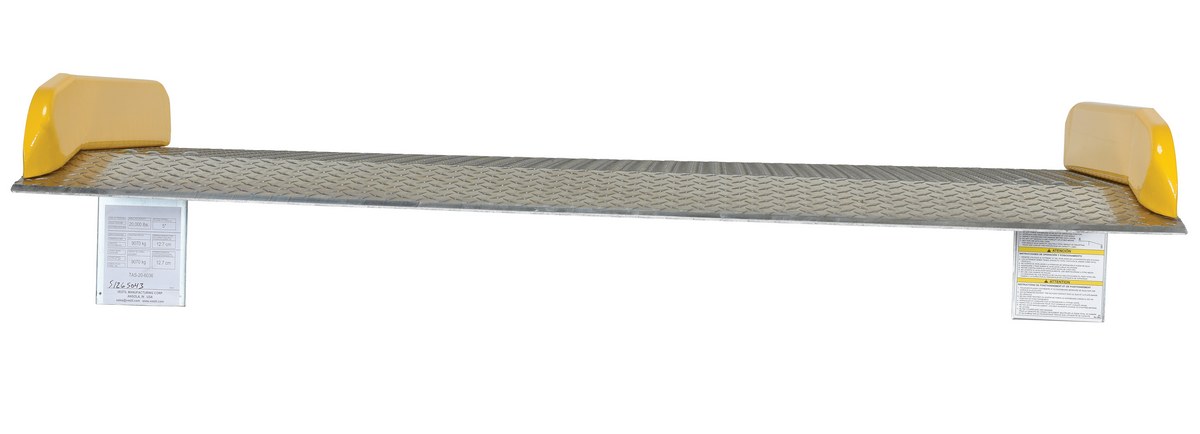 Aluminum Dock Board Steel Curb 60 In. x 36 In. 20,000 Lb. Capacity SilverThe Aluminum truck dock board with steel safety curbs is designed for portability and safety. The deck is made of tough high strength aluminum tread plate. The edges are beveled for smooth entry and exit. Safety curbs are coated yellow and are constructed of steel with cast tapered ends. Steel legs are bolted on for increased durability. Canted locking legs for easier truck portability. Manufactured in compliance with OSHA. The capacity is based upon the heaviest type of equipment used plus the maximum load carried times the single axle rating of total load. Dynamic loading, driver tendencies, speed and frequency of use must be considered. When using three-wheeled fork trucks order dock board with capacity at least four-times the lifting capacity of fork truck. The width of the dock board should be at least fifteen (15) inches wider than the load or equipment passing between the curbs. If the load does not pass between curbs, but is elevated above, add fifteen (15) inches to overall width of equipment.
