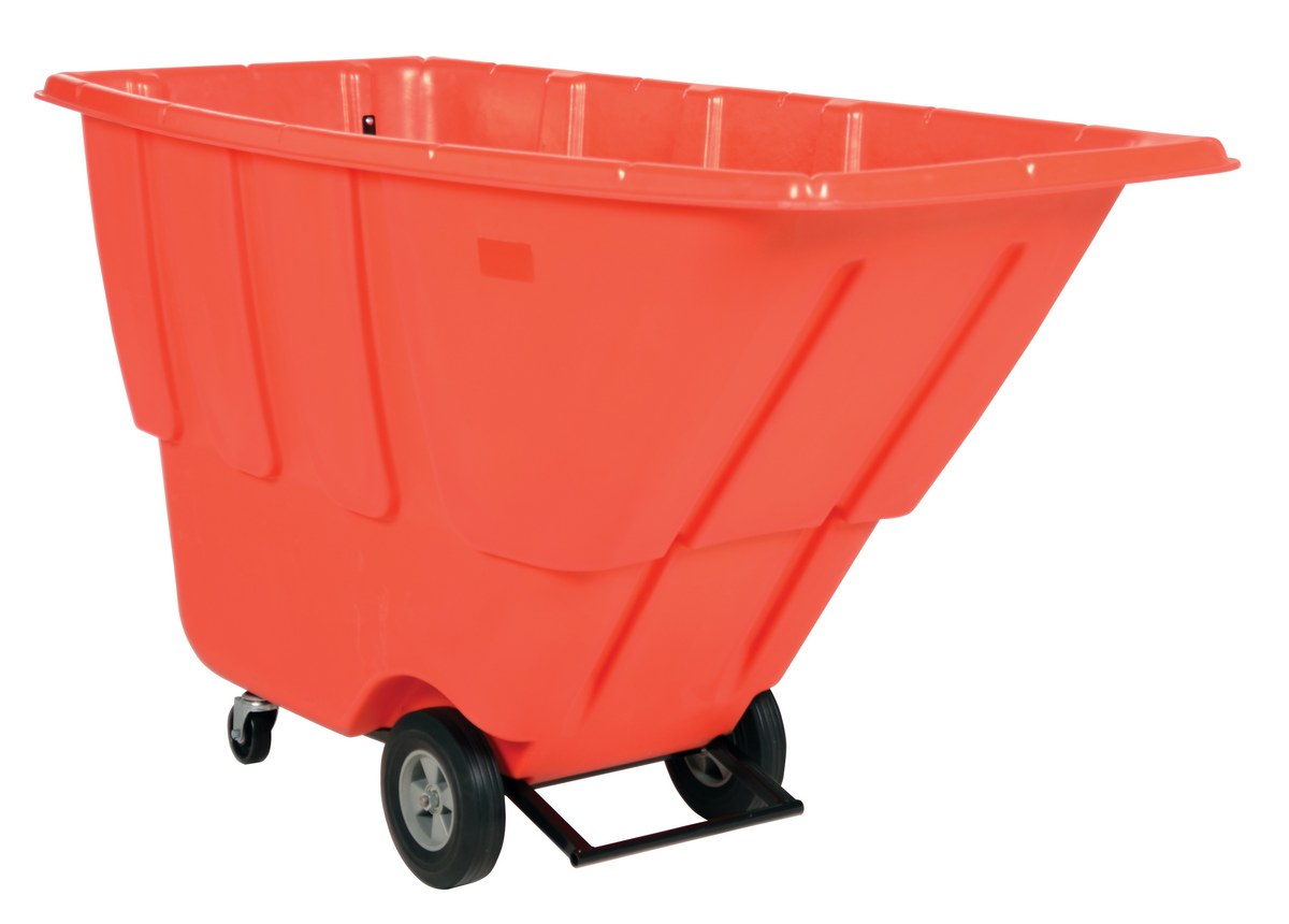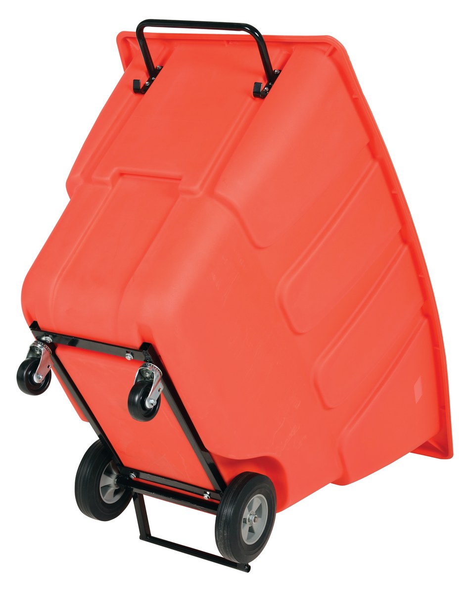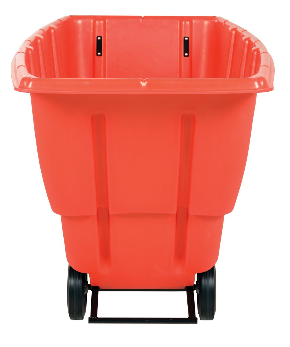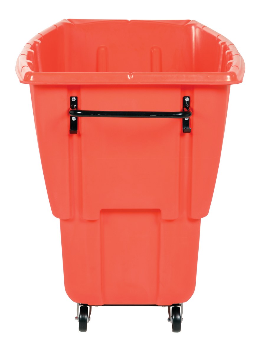 Durable plastic construction allows for collecting waste from multiple bins at a collective time. Great for warehouses, fairs, ball parks, schools, etc. Strong, one-piece molded polyethylene body with steel base tip support and a balanced design to allow for simple dumping by one person. Easily portable on 2 large rubber wheels and two swivel wheels. Not for use with fork trucks. Red color design.