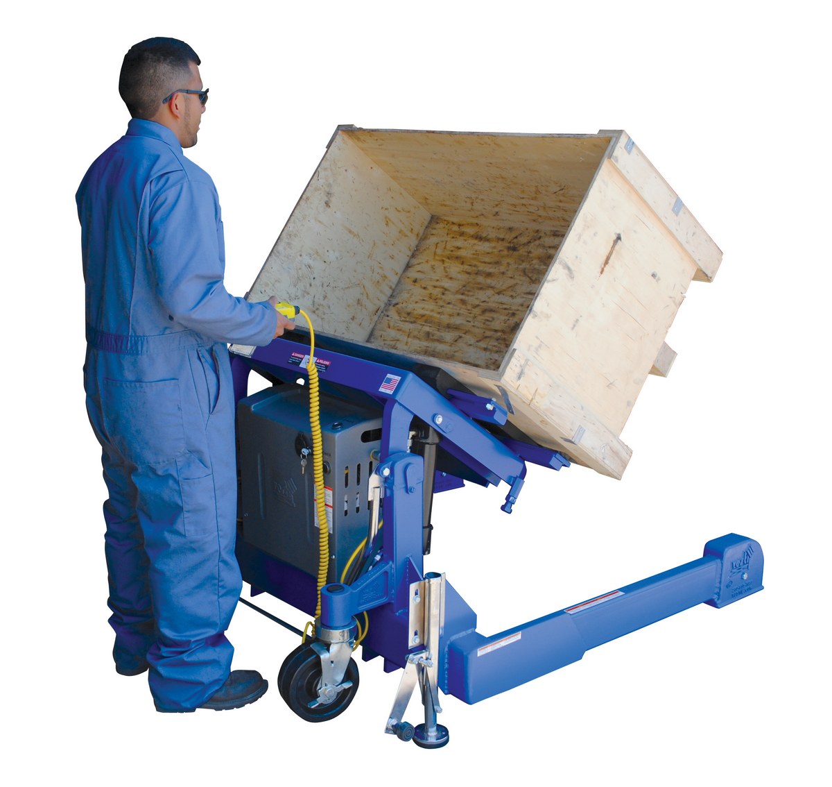 Steel Tilt Master Straddle DC Powered 12 Volt 2,000 Lb. Capacity BlueThe tilt master straddle lifts and positions filled tote boxes or baskets without the need of a fork truck or lift table using the newly designed heavy-duty tilt master. The tilter will function as transporters by moving completed products from work station to work station without waiting for a fork truck. This lift has a thin profile to allow the user to get as close to the load as possible. It also has a standard floor lock and rolls easily on the phenolic steering wheels. Lift is designed to be used with virtually any kind of container or pallet. The unit is powered by a DC electric motor that includes an on-board battery charger and battery charge indicator