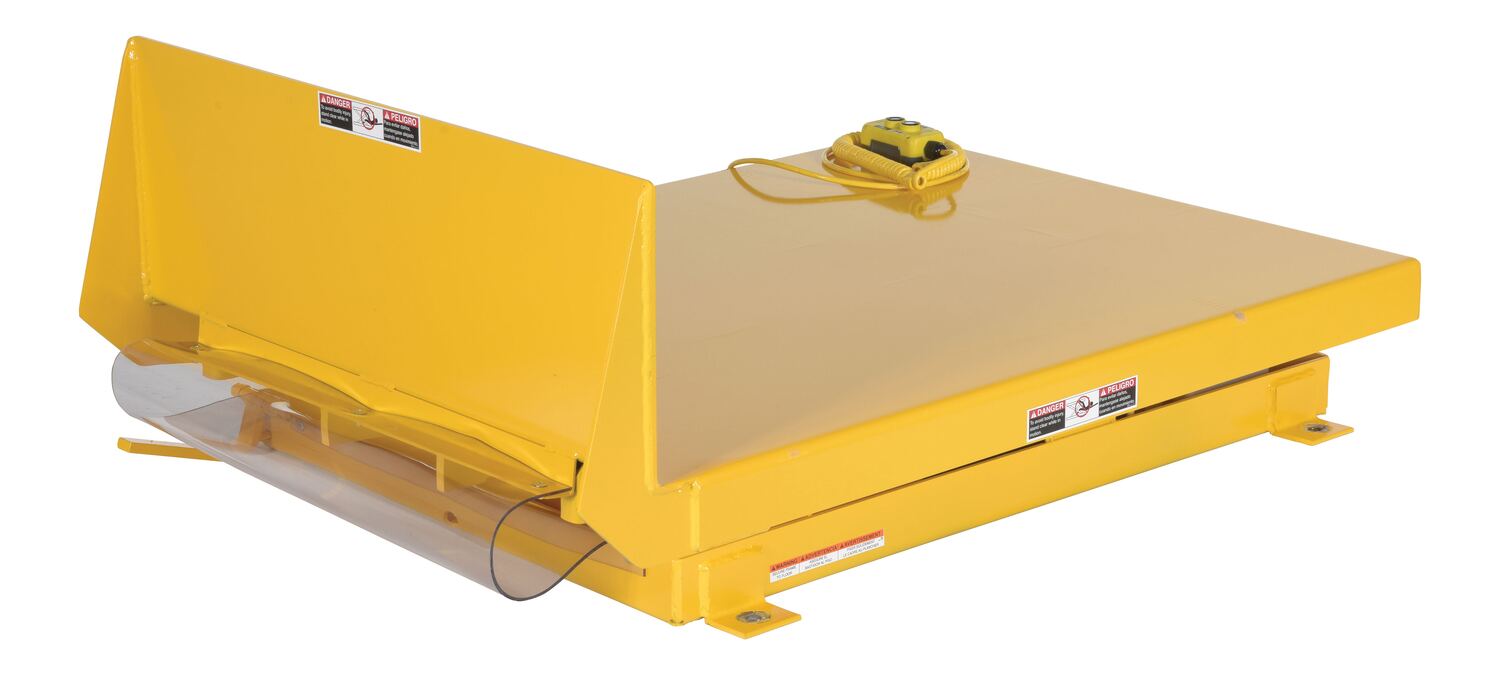The single scissor lift & tilt table is designed to position containers within easy reach of assembly line workers and machine operators. The unique design reduces fatigue by minimizing repetitive bending and stretching required to obtain components from containers. This scissor table comes with a high lip on the tilt side which makes it ideal for parts transfer and assembly. The selector pedal allows the operator to lift while tilting, or tilt then lift. The motor is totally enclosed standard with optional voltages available. Other standard features include: a two-button handheld control, integrated maintenance lock, pressure plated pump, pressure compensated flow valve, lowering valve, independent oil return, and an adjustable upward travel switch. Scissor table must be lagged to the floor.