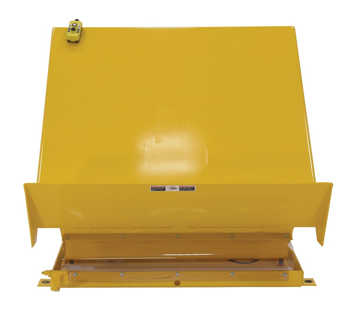 The single scissor lift & tilt table is designed to position containers within easy reach of assembly line workers and machine operators. The unique design reduces fatigue by minimizing repetitive bending and stretching required to obtain components from containers. This scissor table comes with a high lip on the tilt side which makes it ideal for parts transfer and assembly. The selector pedal allows the operator to lift while tilting, or tilt then lift. The motor is totally enclosed standard with optional voltages available. Other standard features include: a two-button handheld control, integrated maintenance lock, pressure plated pump, pressure compensated flow valve, lowering valve, independent oil return, and an adjustable upward travel switch. Scissor table must be lagged to the floor.