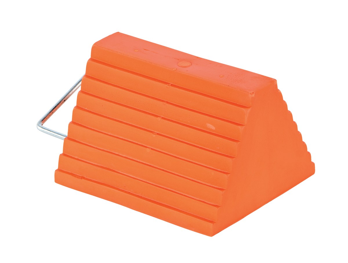 Urethane Standard Wheel Chock with Handle 6 In. x 9-1/2 In. x 8 In. 20 Ton Capacity OrangeThe urethane Wheel Chock with handle is bright orange for greater visibility. Incoming and outgoing drivers can easily see for added safety. Safety tread on chock face provides better grip and reduces slippage.