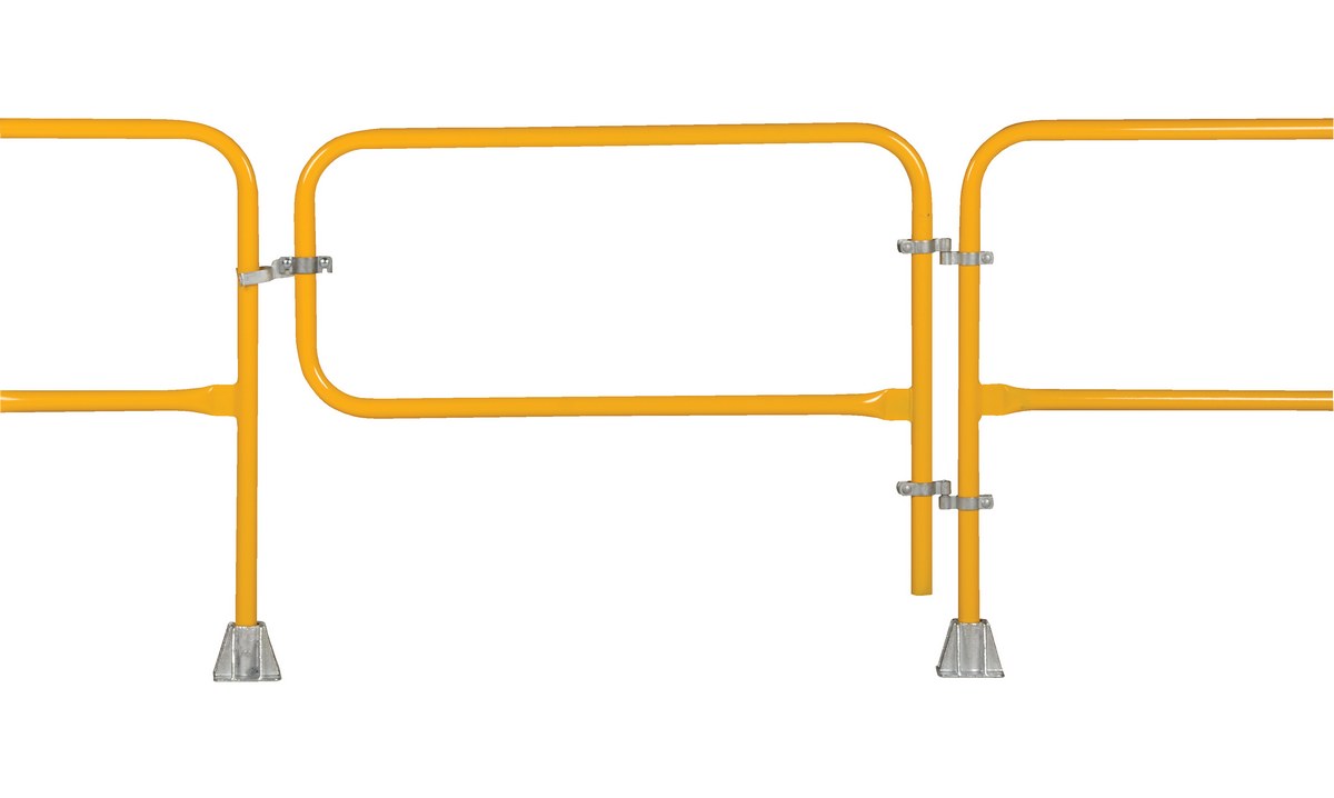 The steel gate works great as an addition to the pipe safety railing. The steel construction is durable and visible with a yellow finish. Hardware for simple installation is included.