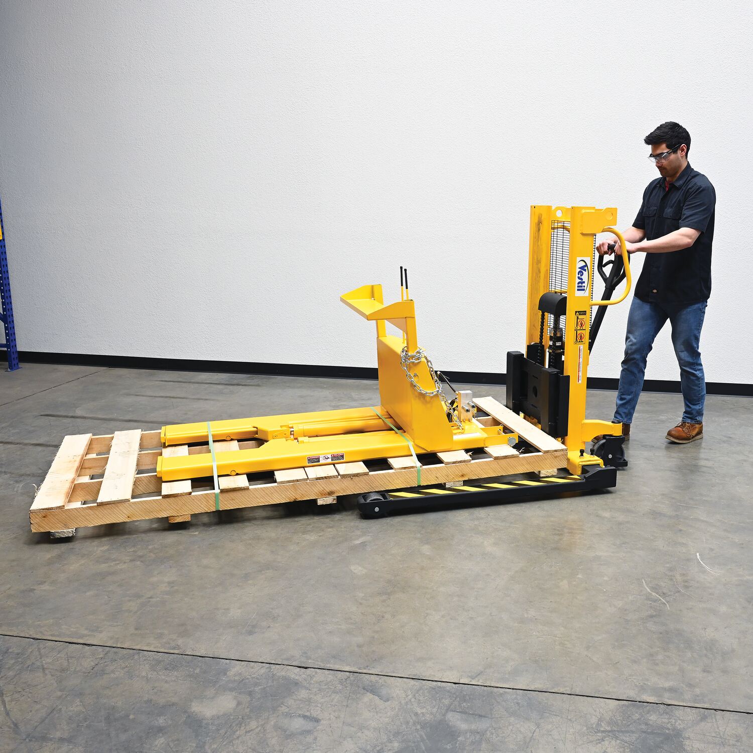 Steel Manual Stacker Adjustable Forks/Legs 550 Lb. Capacity Black / YellowThe manual stacker is designed to meet the most challenging tasks. Ideal for use in various workstation and workplace applications. The full height push handle allows for easy steering and excellent visibility through a welded mesh guard with an optional removable platform also available. It features a heavy-duty mast and a unique winch design for easier and safer lifting. The lifting and lowering is completed by a manual hand pump operation.