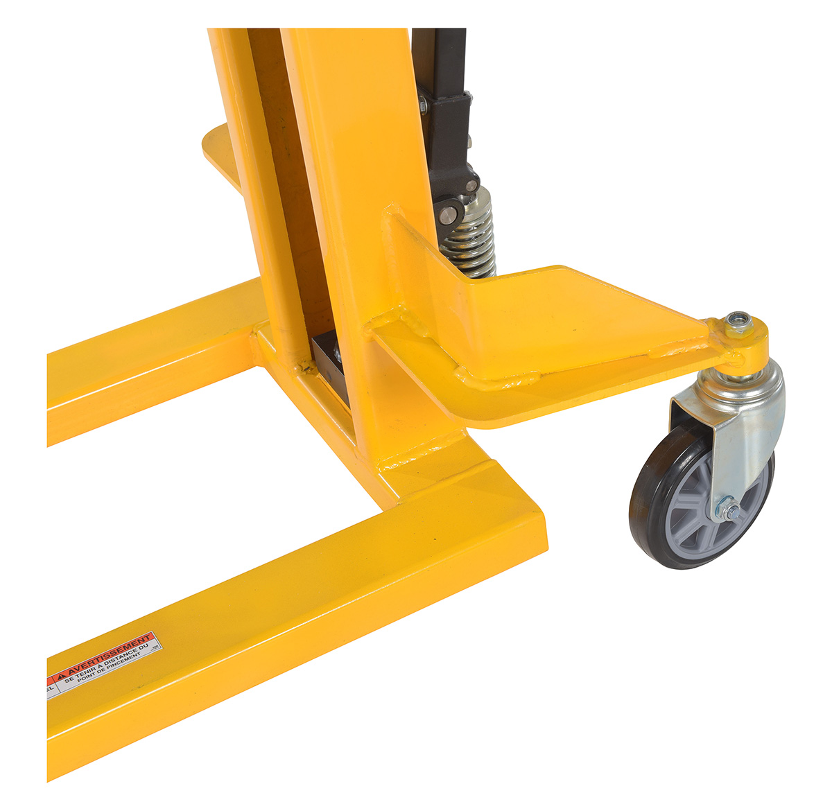 Sturdy and compact to fit through standard doors. Forks are raised by manual hydraulic hand pump operation and released by a lever situated on the handle. 1" lift per handle pump. Two rigid and two swivel wheels standard.