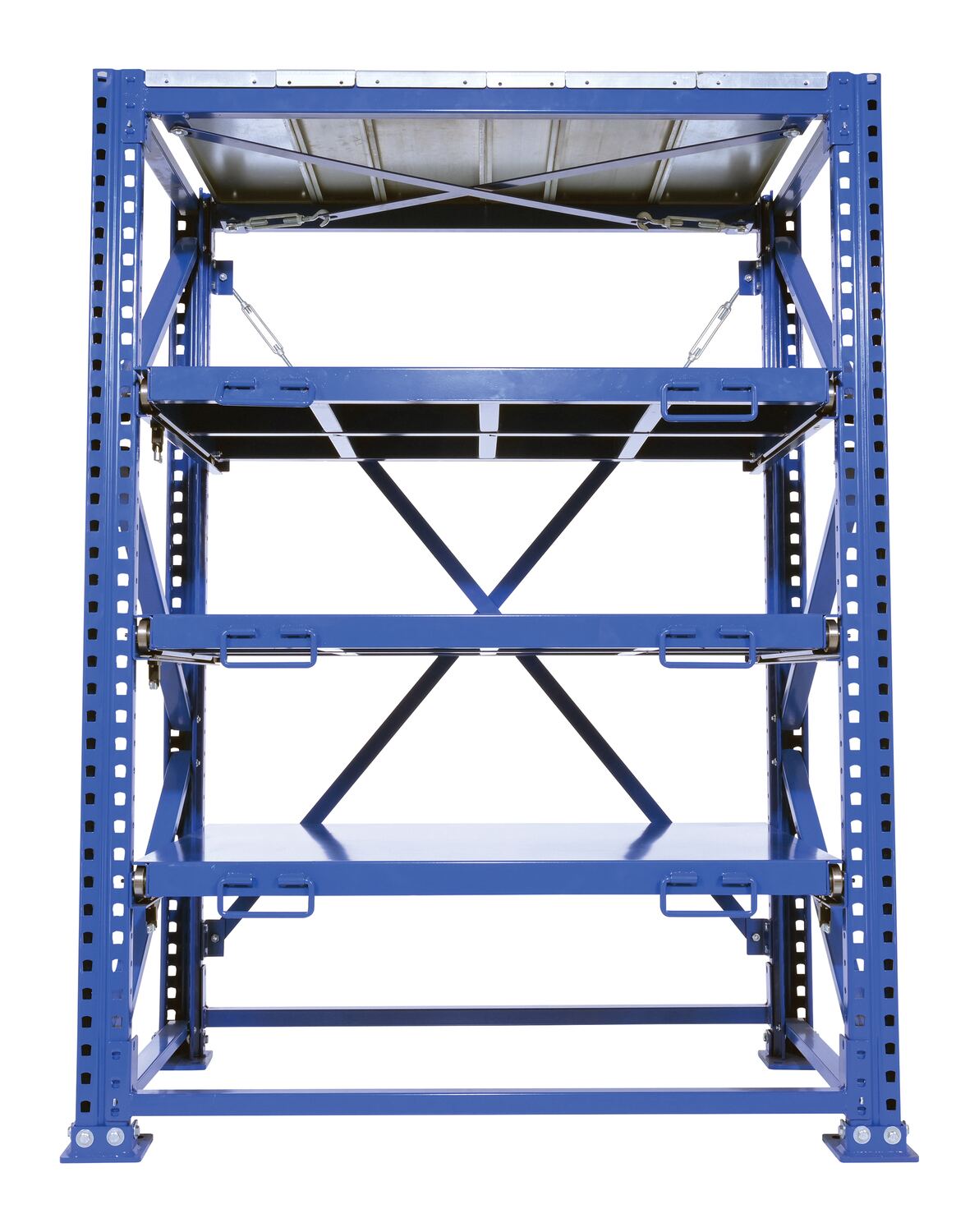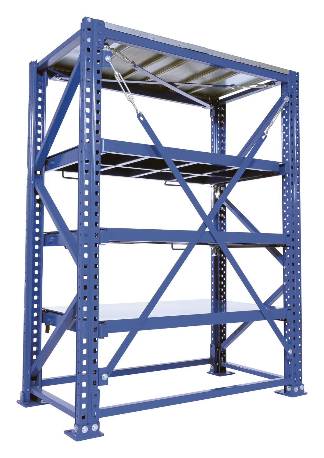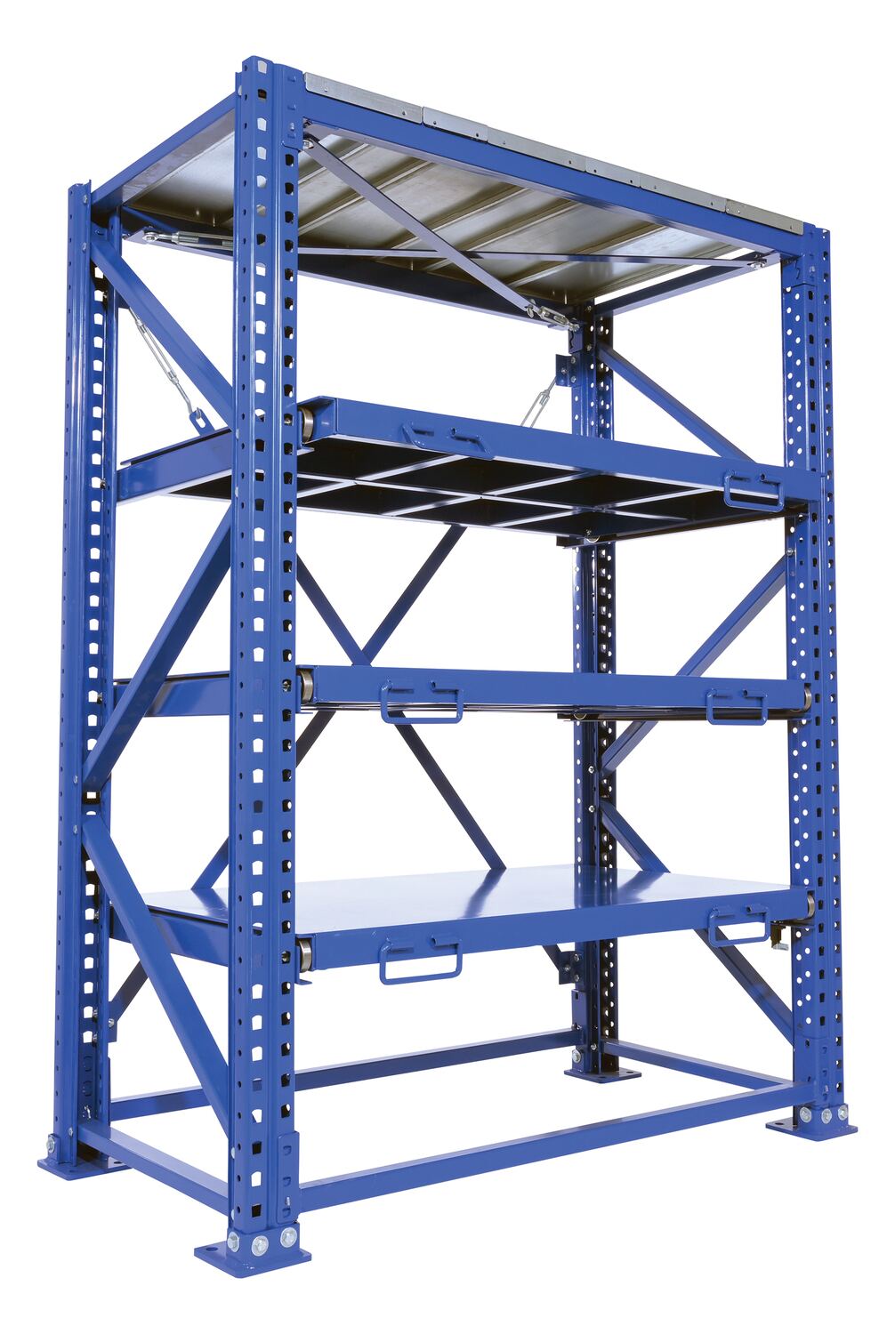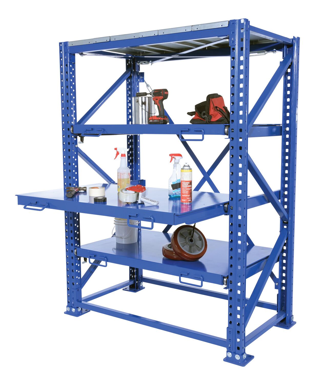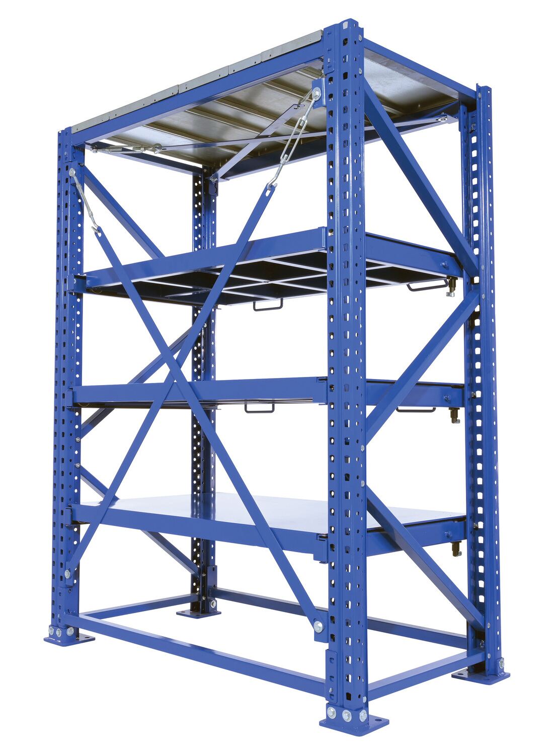 Heavy Duty roll-out shelving supports and stores heavy dies, fixtures and machinery. Shelves should be rolled out one at a time for simple product placement, as well as, personnel safety. All steel construction with powder coat finish. Mounting holes are pre drilled. Assembly hardware is included. Mounting hardware is available separately.