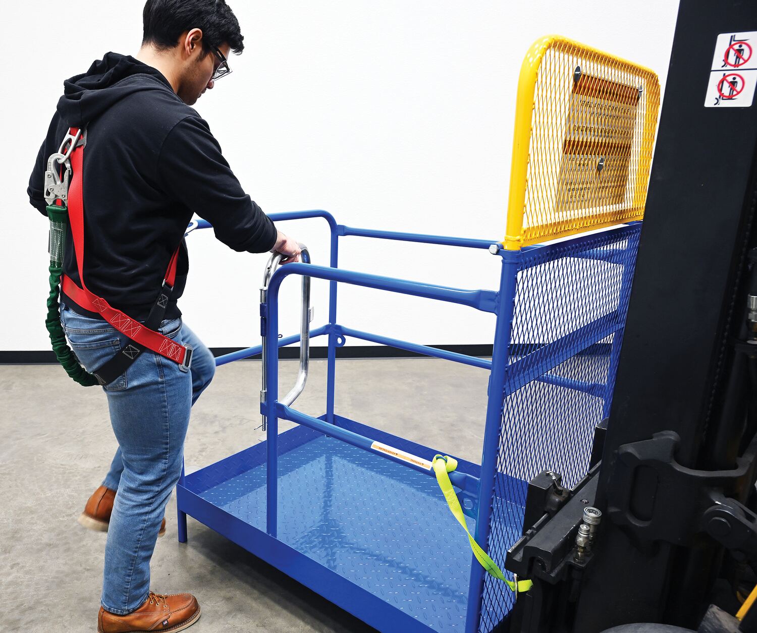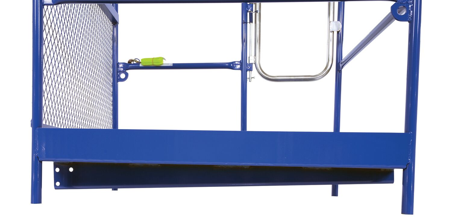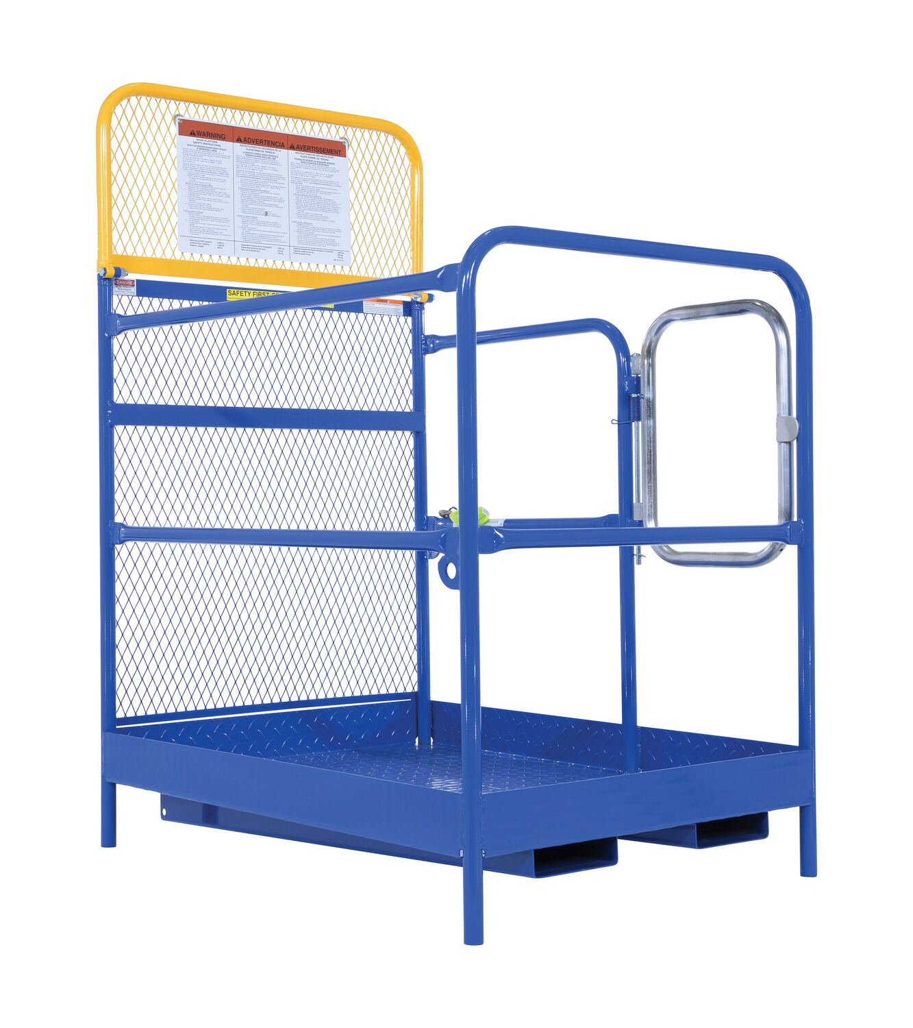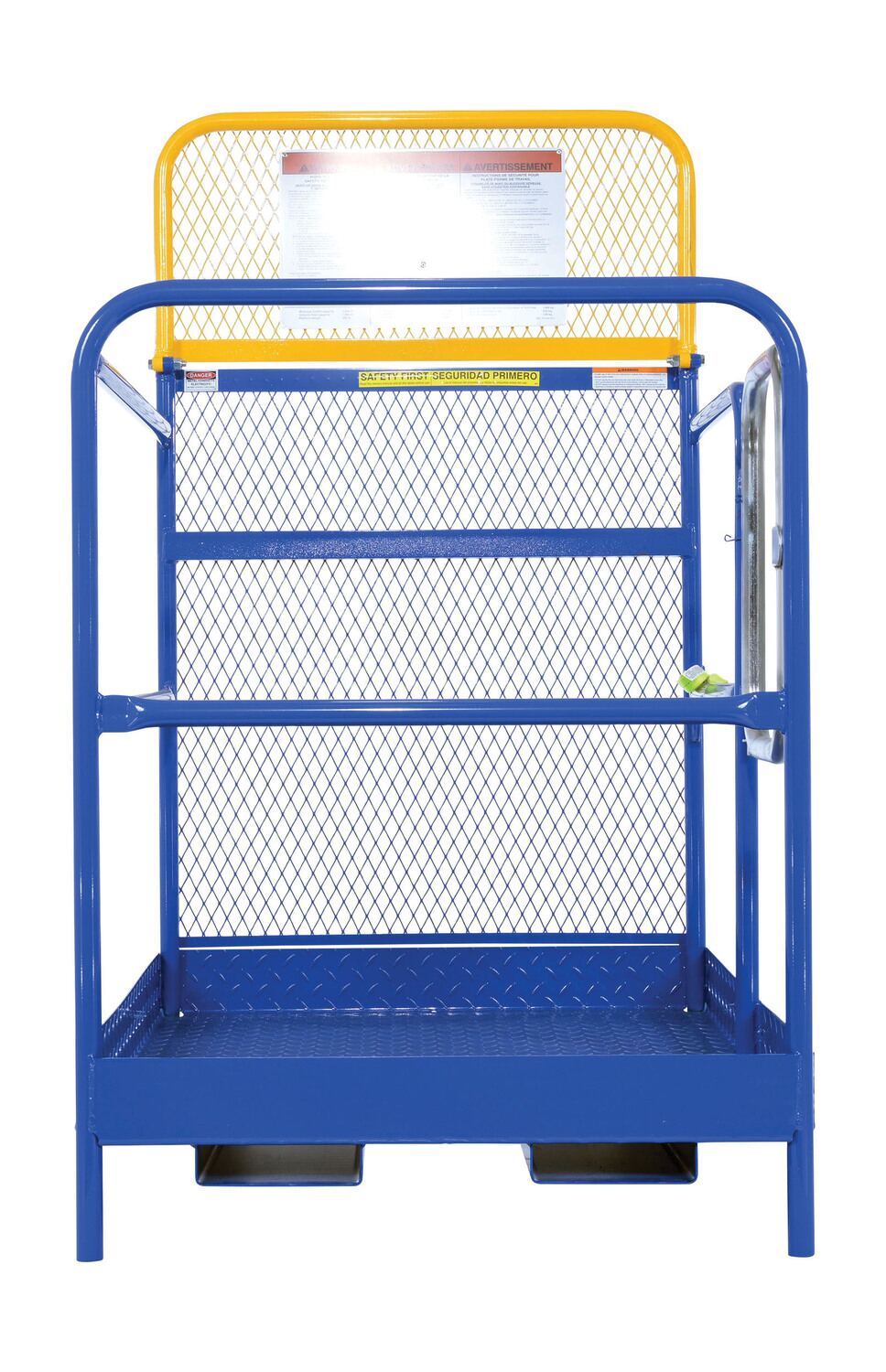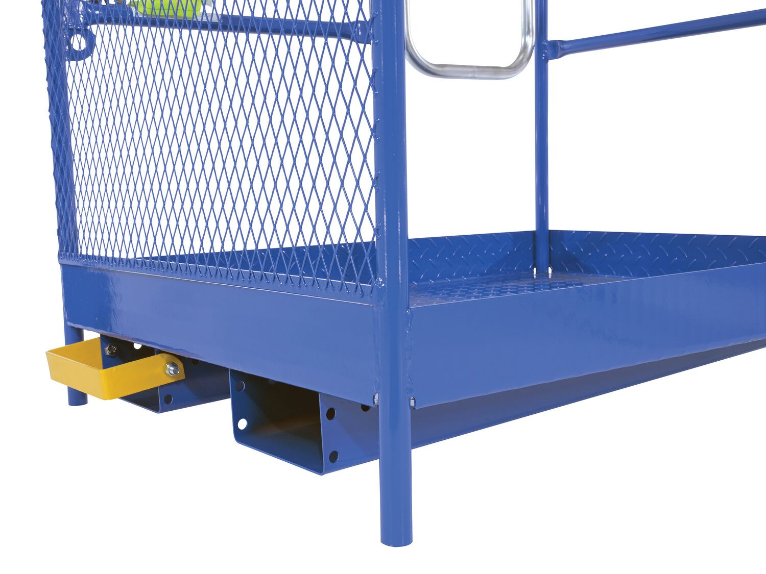 This convenient fork truck work platform quickly and safely raises maintenance personnel where they are needed. Attaches to fork truck by inserting forks into fork pockets and securing platform to fork truck. Fork locks secure platform to forks. Dual handrails on three (3) sides with expanded metal backing on the fourth side. Includes checker floor plate platform and long strap with hook to attach platform to fork truck. A maximum of two (2) people can be in the work platform at one time.