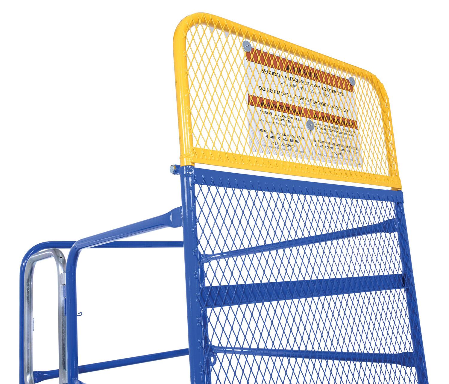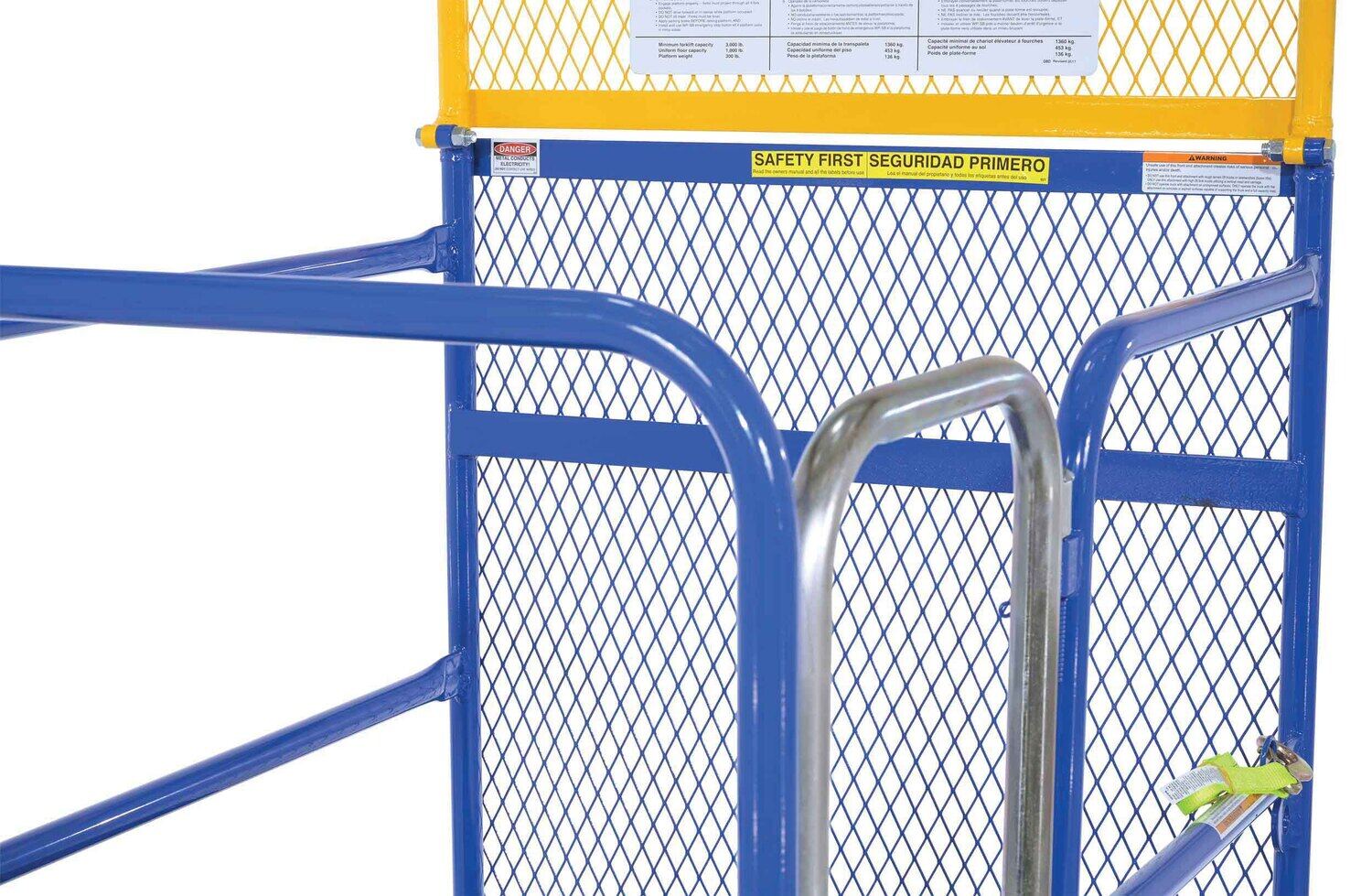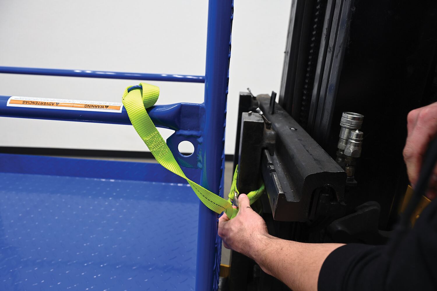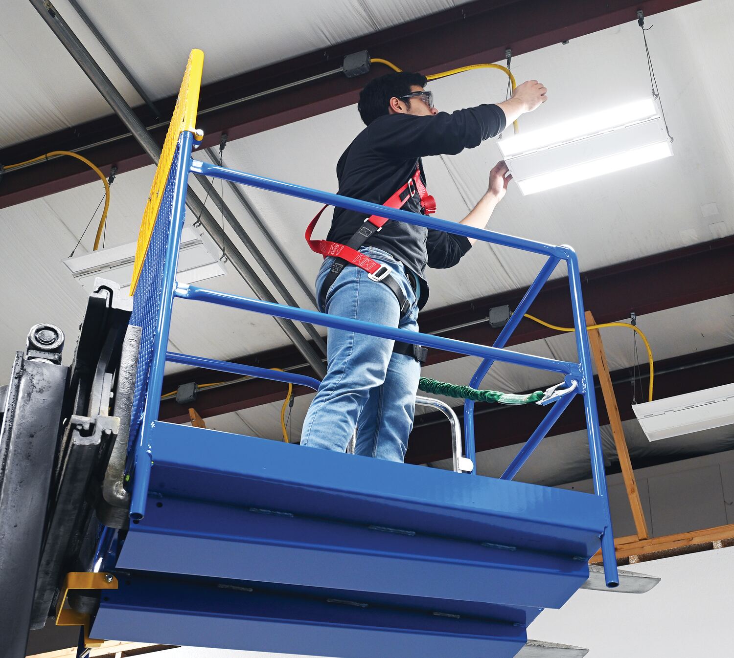 This convenient fork truck work platform quickly and safely raises maintenance personnel where they are needed. Attaches to fork truck by inserting forks into fork pockets and securing platform to fork truck. Fork locks secure platform to forks. Dual handrails on three (3) sides with expanded metal backing on the fourth side. Includes checker floor plate platform and long strap with hook to attach platform to fork truck. A maximum of two (2) people can be in the work platform at one time.