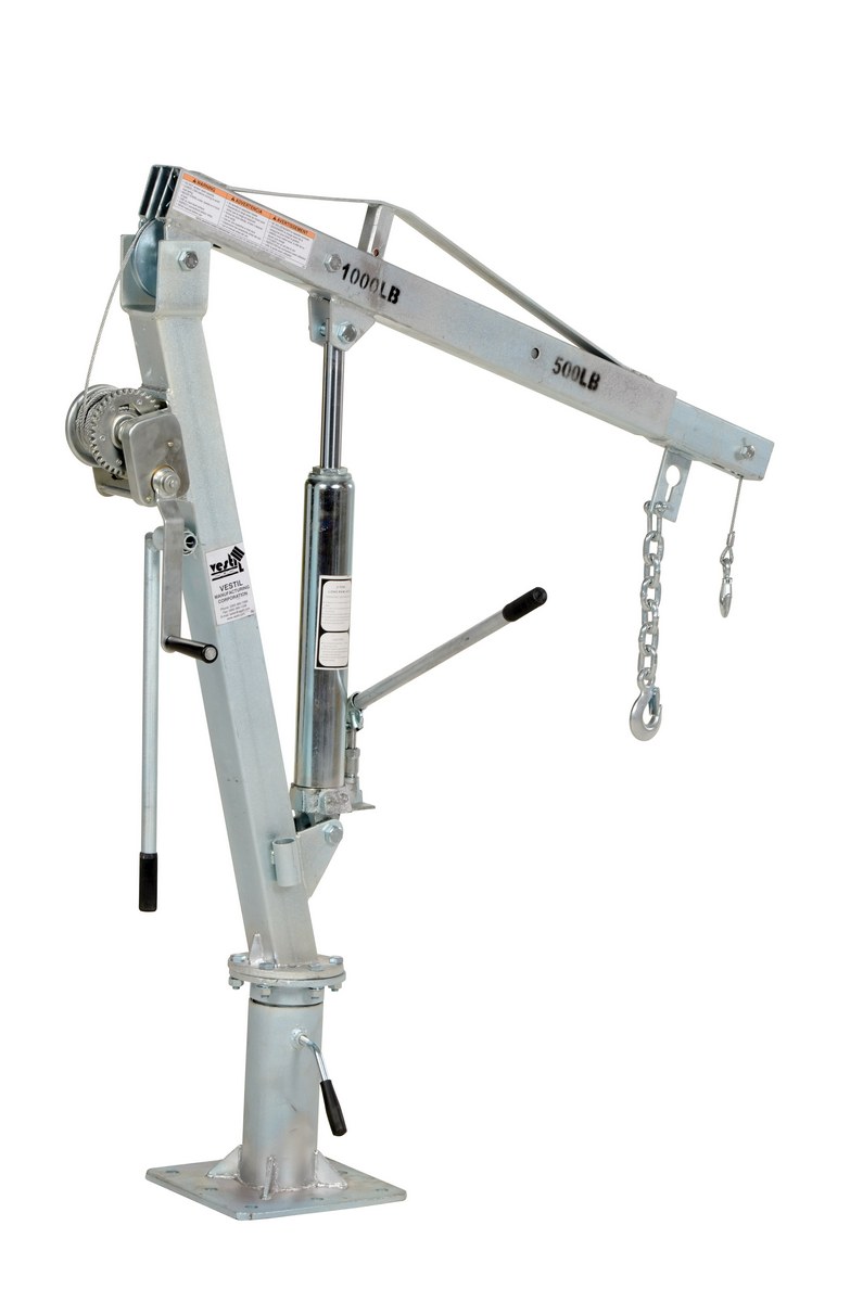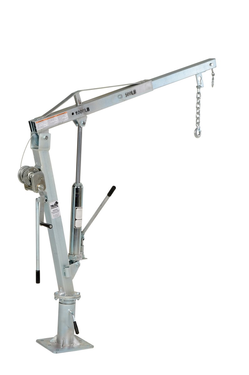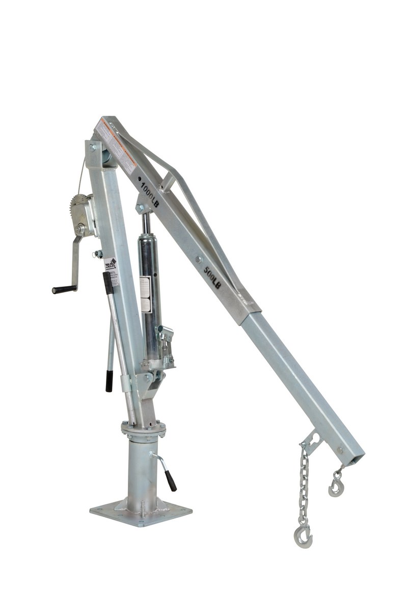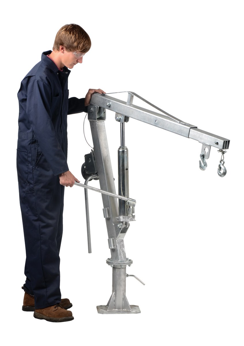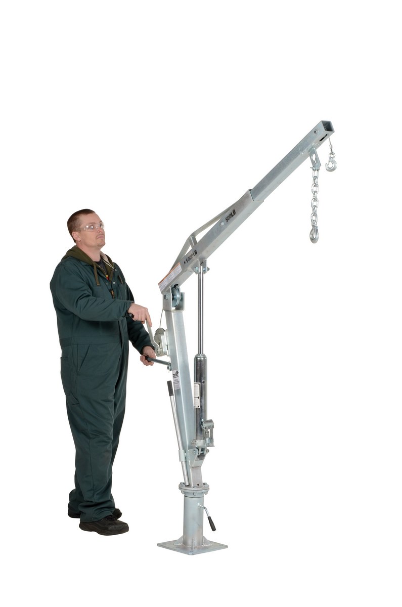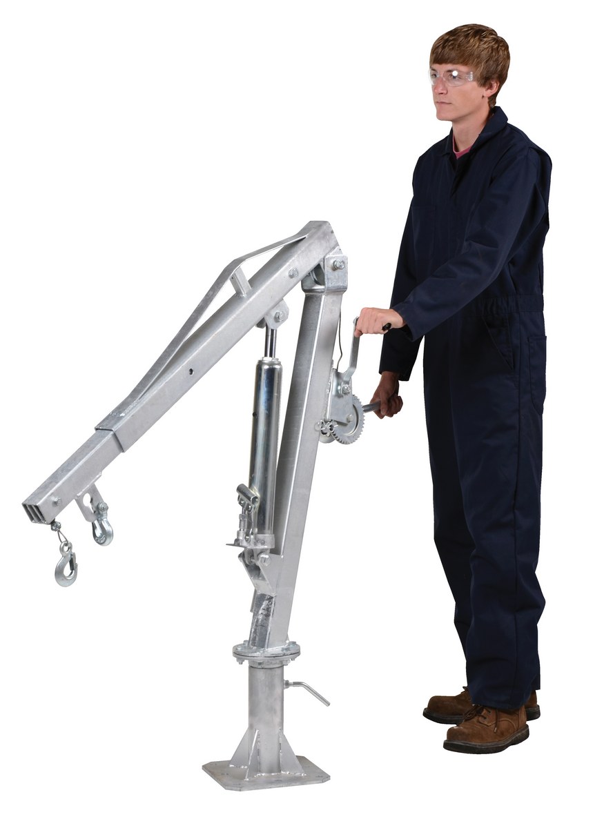 This Galvanized winch operated truck Jib crane lifts items from ground to truck bed height, then rotate into cargo area. Includes telescopic boom design with manual hydraulic hand pump to pivot boom up and down. Manual cable winch to lift and lower loads. Unit comes with one grab hook, one chain slot lock, and one sling hook with latch. Unit is designed for vertical lifting only. Do not use unit for lifting personnel or overhead lifting.